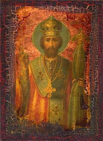 This is a rare icon, or so it seems. This is St. John Chrysostom (c. 347-407). He is my adopted patron saint because of the name, that he was known as a preacher, and, probably, because his inability to keep his mouth shut got him in hot water with the powerful. Termed, "the golden mouthed" for his compelling preaching, he was priest at Antioch, and patriarch of Constantinople. His attacks on the injustice of the wealthy incurred the wrath of the empress Eudoxia and he was banished, recalled, and banished again. I have not found many icons showing him. more icons |